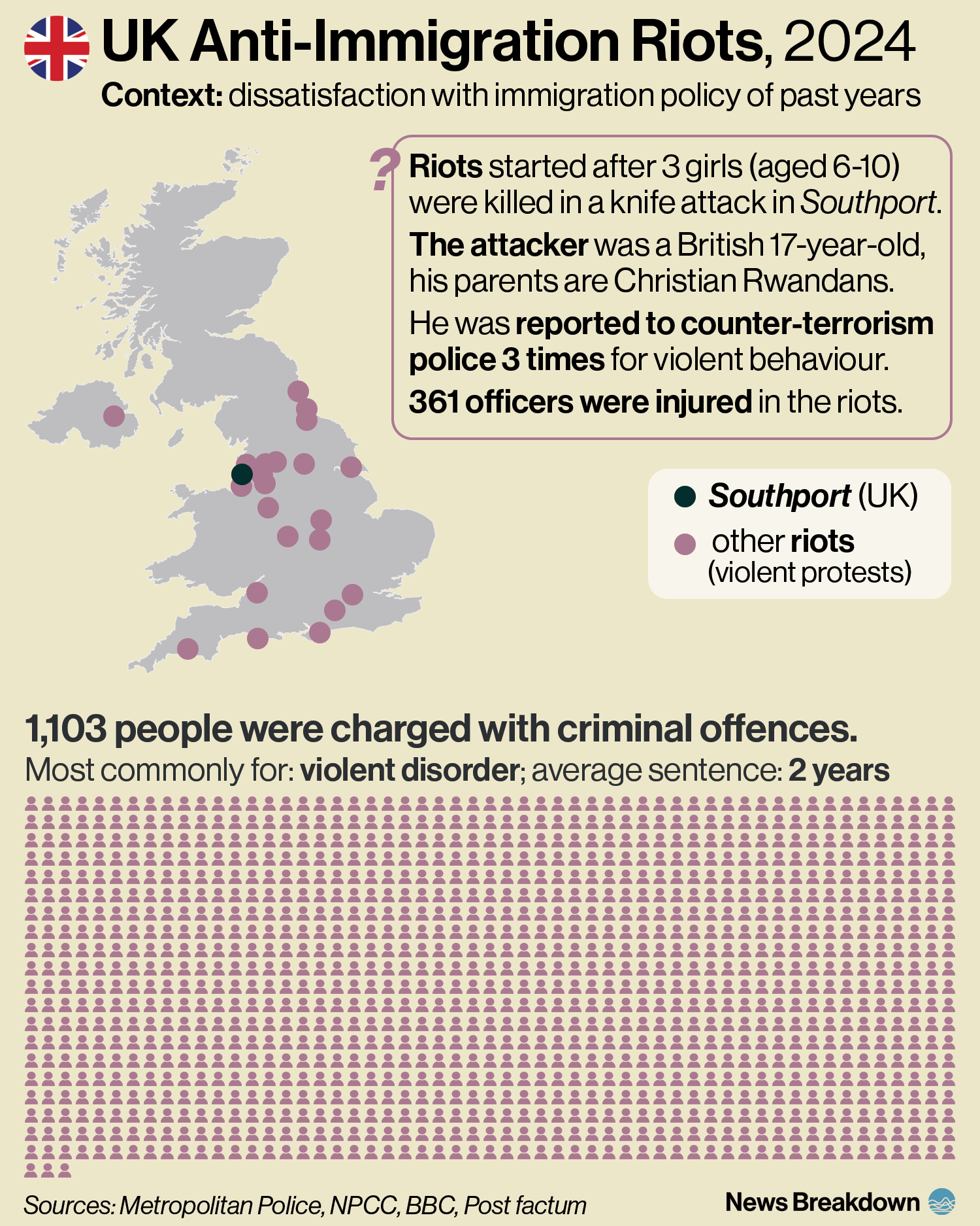 The 2024 anti-immigration riots lasted 6 days. This was the largest episode of violent protests in the UK since 2011.