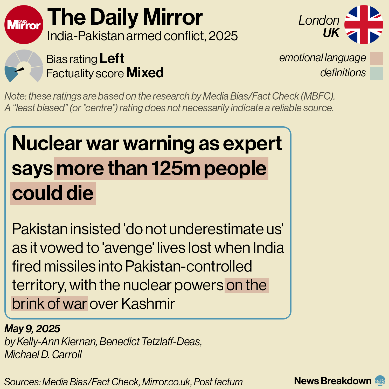 The Mirror warns that a “devastating” nuclear war could break out “at any time” as a result of Indian strikes, quoting a Pakistani official.