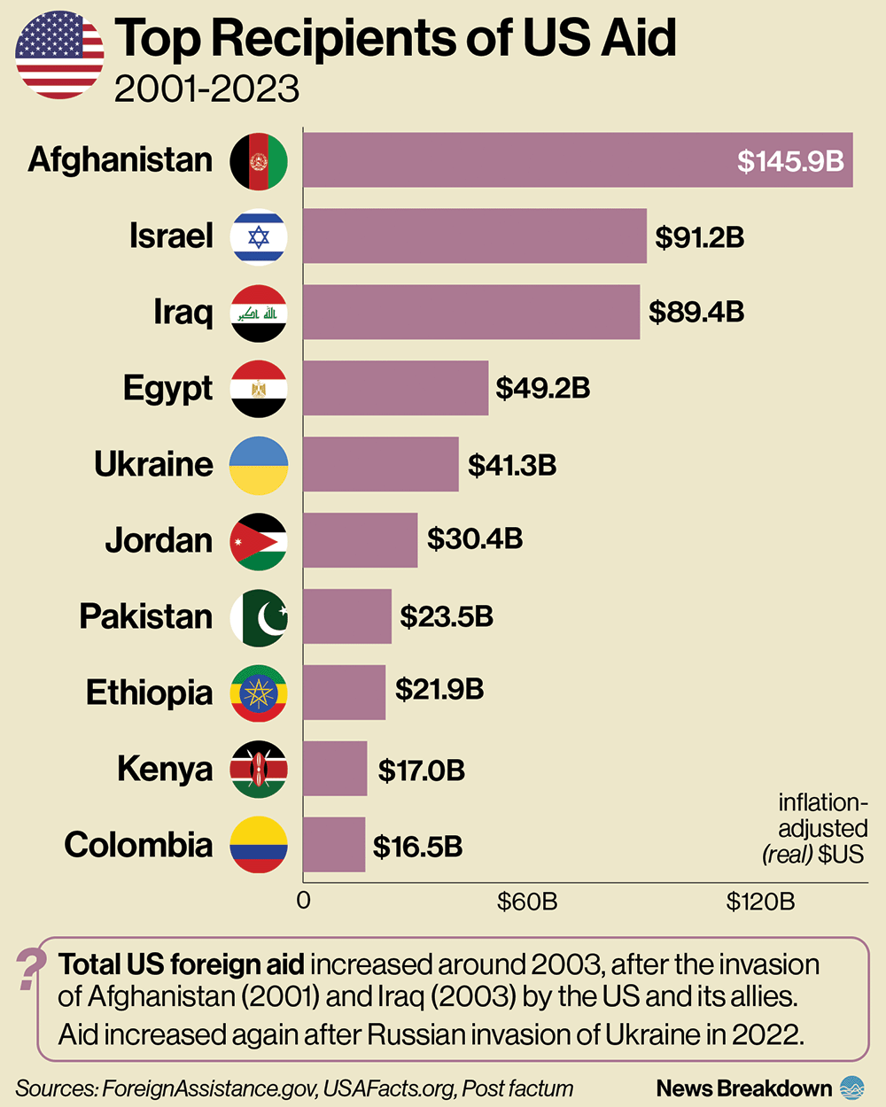 The largest recipient of aid since 2001 was Afghanistan ($146B), which is now ruled by the Taliban, a terror group.